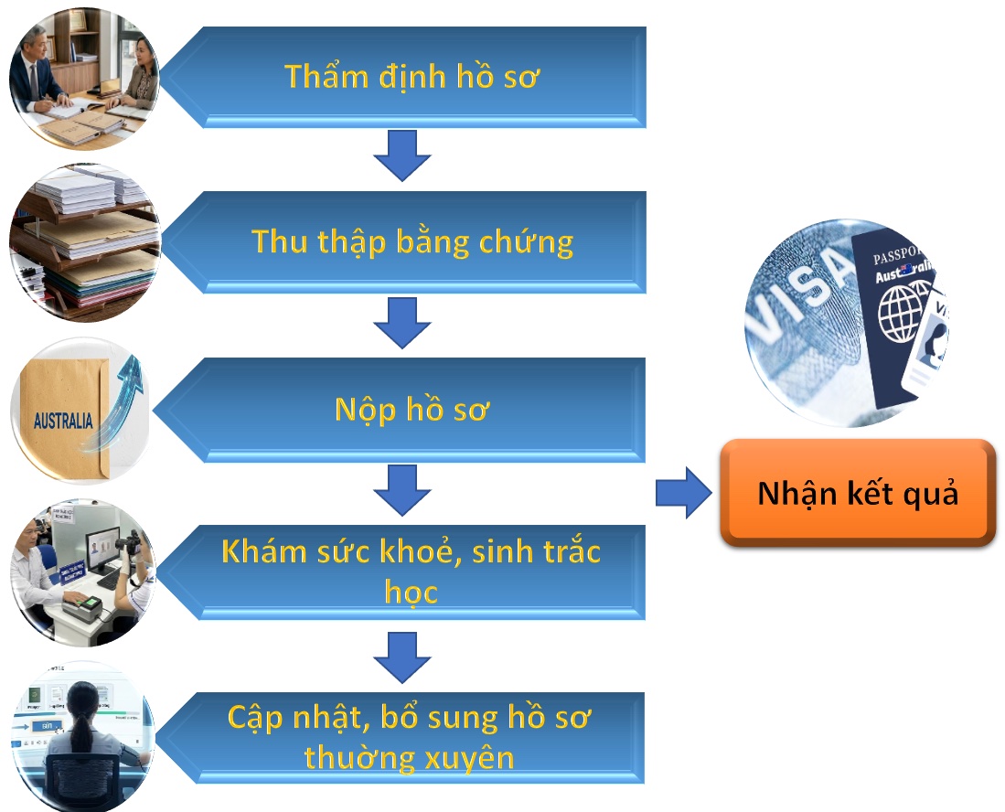 Sau khi chuẩn bị đầy đủ các tài liệu theo yêu cầu và các tài liệu là bằng chứng để chứng minh cho mối quan hệ, chúng tôi sẽ tiến hành dịch thuật, sắp xếp hồ sơ và tiến hành nộp hồ sơ tới Sở Di trú Úc. Công việc có thể bao gồm: